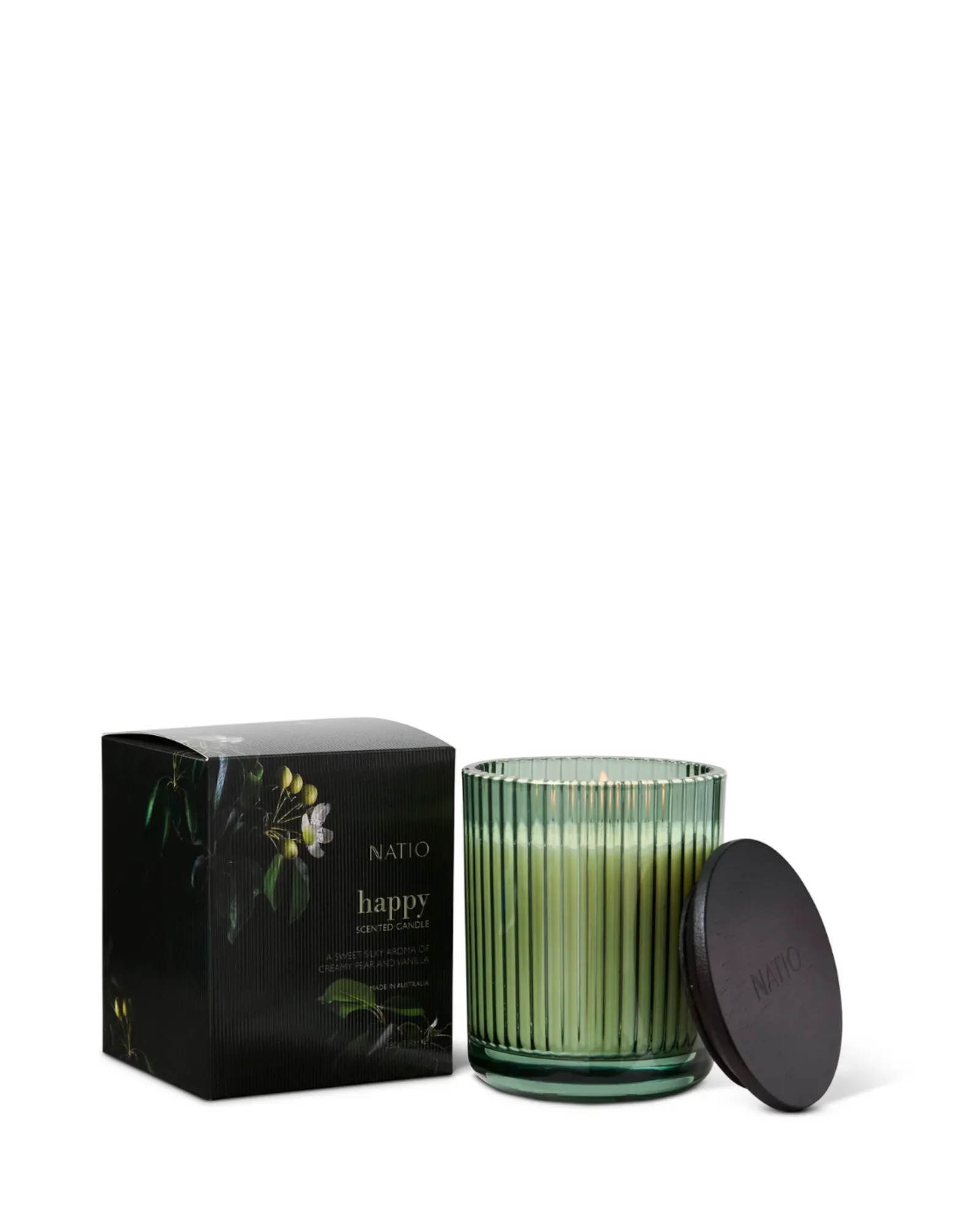 Find optimism in the gentle glow and sweet, silky aroma of this illuminating Happy Scented Candle. Creamy, comforting Vanilla notes combine with candied, caramelised Pear; heady blooms of white Jasmine lighten and brighten with an effervescent floral freshness, a joyful celebration of the sweetness of life. A clean-burn wax with natural soy, lead-free cotton wick and elegant tinted, rippled glass casing offer a naturally cosy and stylish home fragrance solution. Burns for up to 50 hours. Made in Australia.